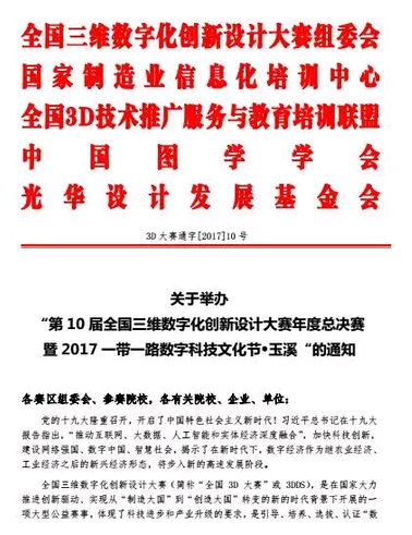 第10屆全國三維數(shù)字化創(chuàng)新設計大賽年度總決賽暨2017一帶一路數(shù)字科技文化節(jié)定于2017年12月6日至12月9日在云南省玉溪市盛大舉辦。“數(shù)造杯”數(shù)字化創(chuàng)意設計與智能制造(3D打印)大賽作為主活動之一,將于12月6日-12月9日同期舉行。現(xiàn)將相關活動具體安排通知如下: